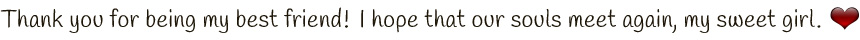 Thank you for being my best friend. From the moment that I met you as a puppy, I knew that we shared a special bond. Thank you for being my favorite one to share my happiness and sorrows with over the past 10 years. You were my favorite one to love on first thing in the morning and last thing to spoil at night, and during many, many daily moments in between. I am having a painful time not having you in my life now that you have moved on, but know that you are deeply missed and you will always possess a large piece of my heart. I love you Aspen Bear! I hope that our souls meet again, my sweet girl. Kerri & Travis McAfoos |