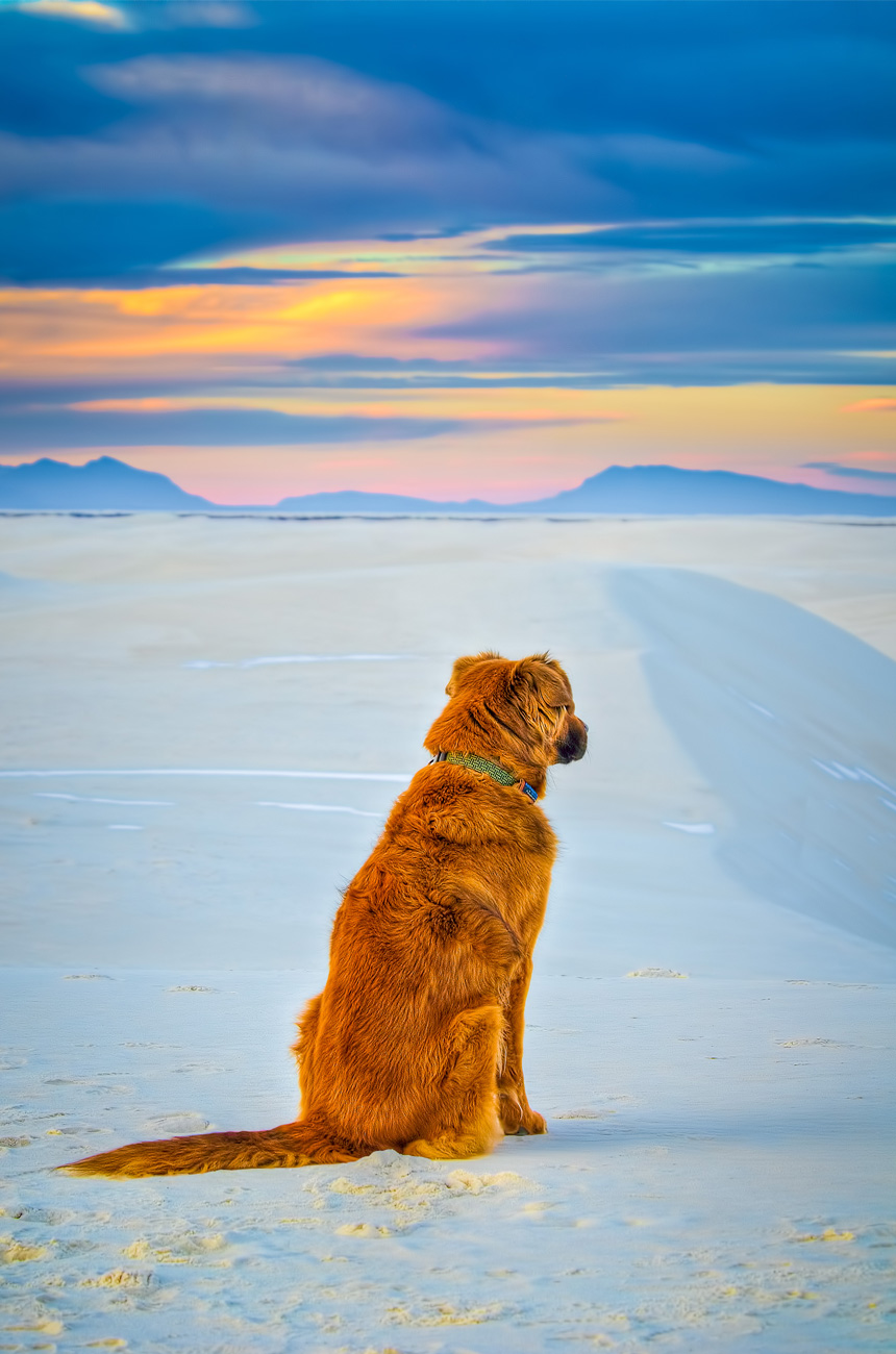 Photo taken at White Sand near Alamogordo, NM. It is sunset and he is listening to a pack of coyotes. |