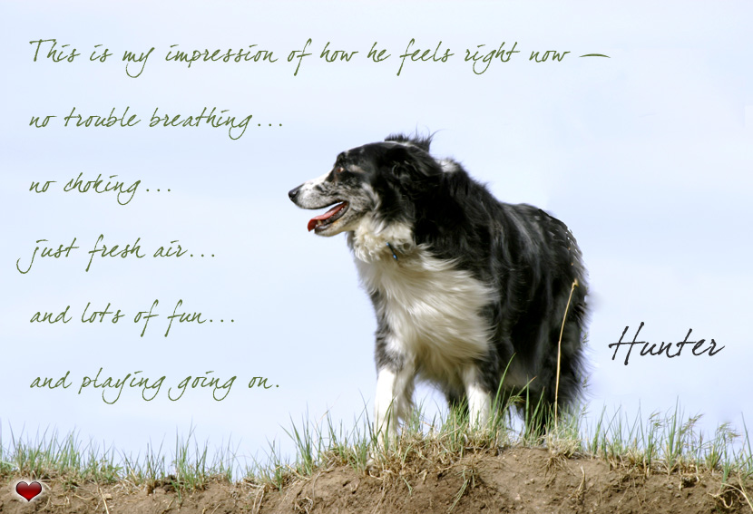Thanks again for your peace and sympathy for our loss. It is by far the hardest decision we have ever made. My husband wrote the following prose that night — Dog Lessons Ya know...there are lots of things dogs teach us. Probably the first and best thing is unconditional love. There is nothing like the tail wag and silly grin that you receive from your four legged friend when you come home! The bouncing joy of your pal, just happy to see you again! Exercise. Come on, throw the ball! Or the way a dog perks up, jumps up when you say "let's take a walk"! Your dog is always ready and willing. And do you remember when your dog swam out to the canoe? How many times did he do that? Six or seven? Then helping him into the canoe, him shaking off, and soaking you, then leaping back into the lake! There is something there too about the joy of the moment. Camping. Sometimes we would do it just to see how excited Hunter would get because we were "going camping"! Then there was the "happy dance" and the happy humpies! I love you. The talking dog. The family that howls together stays together. The laughter that comes with that, priceless. Shower time. After a long flight or a long time on the road, doesn't a shower feel just great! My dog reminded me about that too. The puppy came out in him after he had a bath! Dried as much as possible in the bathroom, he would come out and rub along and under the couch rim. And then there was the "post bath" tearing of the towel ritual! We always used an old towel because the bath always ended in a tug of war with a towel, and the towel was always the loser! Shredded towel everywhere! And just for the joy of it! But they always seem to leave too soon! So I see in this the brevity of our own lives. And my dog reminds me to say "I love you" more, go camping and every once in a while, jump out of the canoe! And in the end, learning about how to say "Good Bye" to a loved one. For the preparation in grief is yet one more thing my dog has taught me, that the time may be near for any one of us. That's what a dog can do. David |