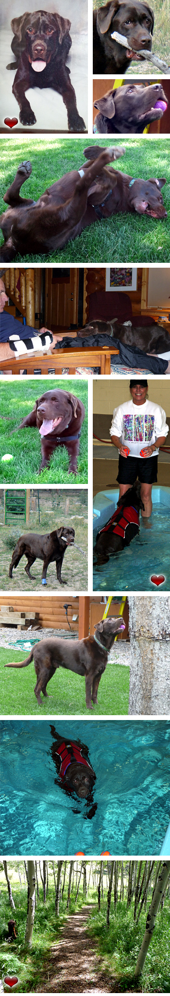 ![]() Isaac (The Wonder Dog)August 21, 1999 – February 6, 2012A Story of a Life Well LivedThe hardest thing about writing a memorial tribute for a loved dog is what to leave out. I have had many, many pets in my 59 years all of whom I loved dearly. Unfortunately, most of them died too young or before what I thought should have been their time. Isaac was a "double-dipped" Chocolate Lab who lived to a ripe old age of 12-1/2. Because he was so youthful looking, with only a faint patch of grey under his chin, many people thought he looked like he was many years younger. He certainly acted as though age didn't faze him. My thought was that if Isaac remained healthy he would have easily lived to be 14+ years old. In fact, I would tell my husband that we shouldn't tell him how old he was because in his dog-mind he was a two year old. What Isaac brought to our lives cannot be measured. It can only be felt in our hearts and that was of an abundance of unconditional love! I bought Isaac for my husband after his mother passed away. He was seven weeks old and from the moment Richard picked him up the bond between a man and his dog began. Isaac (the boy) and his dad became the inseparable "big guys" and where Richard went so did Isaac. At our house in Nederland Isaac enjoyed taking long hikes on National Forest land always leading us out and back like a loyal scout. Of course he had to have his favorite stick which was quickly replaced on the way back with a much bigger and better stick. In the summertime Isaac loved relaxing on the deck or on the cool, freshly cut lawn "surveying" his land. He would walk the path lined with Aspen trees that took him to the lower part of our property sniffing out the scents of elk, deer, coyotes, bobcats, mountain lions and bear. He would leave his "mark" to remind any intruder that it was his kingdom. One had a sense he felt it was his job to make sure all was well. The squirrels always loved to taunt Isaac by staying just out of his reach on the tree trunks. He would be sucked into their game believing this time he was going to be victorious. Isaac always approached any opportunity for pursuit with one of his numerous tennis balls in his mouth. Living in the foothills we enjoyed providing food for the many critters that called our place home for the summer. We became a feeding station for the hummingbirds that spent several months raising their young before making the long trek back to their winter homes. These small wonders could consume a gallon or more of homemade nectar, daily, and it made for the most amazing sight at sunset when hundreds of them would have their last meal of the day. One of my most favorite stories to tell of the gentleness of our "handsome lad" was the time a hummingbird was stunned as it flew into a window near where Isaac was sleeping. This would happen occasionally and when I would hear the slight "thunk" I would go outside and retrieve the stunned bird. I had a "healing" box that I lined with a towel and would put the hummer in the box to let it recover: leaving it in a cool spot on the deck. On this particular day I heard the familiar sound and went to the deck to look for the bird. I wasn't able to find anything but noticed Isaac was standing by the window. I had a sense that there was something odd. As I looked at him closer, I noticed that he was holding his mouth in a semi-opened position. I walked over to him and lifted one side of his jowls and saw tail feathers. When I opened his mouth there was a small, very wet, frightened hummingbird. I took the bird out of Isaac's mouth, dried it off and put it in the box. The little bird recovered for about an hour before flying off to its family. I couldn't help but think that this tiny creature would have quite a story to tell. Isaac did things that were unique to him. When he was younger and the first time he saw a full moon rising through the trees he put his paws on the top rail of the deck and barked. This became a ritual every time there was a full moon. We weren't sure what was going through his head or what he thought he was going to accomplish by barking but I think he felt he needed to warn us of some extraterrestrial object approaching. This led to Richard pointing out the planes that flew overhead. We live at 8,400 ft. and the night sky is beautiful and clear. Airplanes were easily spotted and Isaac learned to look up and track their movement. He would make a low growling sound or bark: I believe to warn us of this odd thing in the sky. Isaac also loved his toys of which he had about 30. He had a toy box that held these treasured objects. Isaac was able to pick out, on command, a toy by its name even if it meant digging through the entire box to find what was requested. A year ago, Isaac had TPLO surgery (Tibial Plateau Leveling Osteotomy) done by Dr. McAbee at Alameda East Vet Clinic. He started doing swimming to rehab his leg. Being a lab, he fell in love with this activity. Isaac looked forward to this new found way of running without the impact – something I called doggy aqua jogging. This became Isaac's new favorite exercise. In fact until three days before Jason released Isaac from his cancer-ridden body, he swam. Just like every other time in the pool Isaac overrode the pain and acted like a young, happy dog. The final chapter in Isaac's long life began when I noticed a swelling above his back teeth on his left side. This led to the discovery of a tumor that started in the roof of his mouth that had spread to the back of his eye and to his mandible. From the time the tumor started growing until it was diagnosed was most likely just a couple of months. The shock of the news was the cause of some very deep sadness for both Richard and me. We were told that depending on the tumor diagnosis we most likely had no more than six months with him. After researching our options for treatment, we chose to take Isaac to CSU to get Steriotatic radiation to stop the advancement of 
