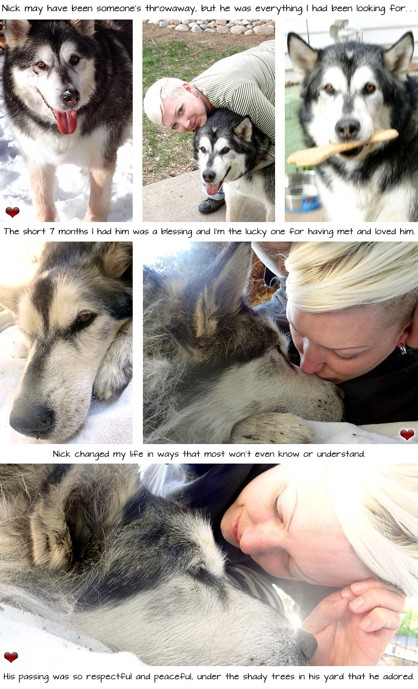 I had been looking for an older Husky or Malamute for a while, one that would get along with a gentle child, and my cats [indoor and outdoor feral]. Any artic breed lover knows that finding one that is good with cats is a challenge. They are out there, but sometimes difficult to find. I came across a picture on craigslist of an older malamute that was rescued by Shiba Scout Rescue because he was on the euthanization list. [he was older and had some leg issues so was deemed unadoptable] They branded him "St Nick" and also rescued a handful of other pups the night before Christmas. But I had to stop myself and ask – was he good with cats? I knew he was good with kids because he was pictured with a toddler running around the yard. I put in my application and decided to "foster to adopt", just to make sure he was right for our family. The big guy came to my house at night, kinda stumbling off the car ramp, you could tell he had some leg issues, but was this 95 pounds of just sweetness and uncertainty. [I was keeping my heart guarded just to make sure he was right] After a week with him, I couldn't help but fall in love with this old man who clearly had some past traumatic issues, but was obviously somebody's dog in the past [he knew EXACTLY what a fridge was, knew sit, and shake] Nick LOVED hanging out in "his" yard, guarding by the door, watching the world pass by, as he could do as he pleased [indoor and out]. He preferred sleeping outside, [like a lot of artic breeds] which I initially was against, but it pleased him so, and I wanted him to be happy and just live a content life, as he should. Over the next months I had him, I realized he had several medical issues in addition to NOT liking to be picked up, or his legs touched. He HATED car rides and would literally tremor, fight me, head butt me, anything to NOT get into a car. I called him Hannibal often because he had to be muzzled in order for me to do anything with him. We had several scares with him getting ill but he always pulled through. The last time he became ill, I knew something was "different" with this illness and within the first day, called Jason to come out to see him since I felt taking him in the car would just stress him out even more. Jason was so kind and assured me after examining Nick that we were doing the right thing when he realized his system was shutting down. His passing was so respectful and peaceful, under the shady trees in his yard that he adored. I had a talk with Nick before Jason arrived because I had a feeling this was it – I wanted him to know how much I adored him and how happy he made me. I told him I wasn't sure what his life was like before me, but I can only hope I created an environment of safety, happiness, and love for him. He may have been someone's throwaway, but he was everything I had been looking for and he was the perfect dog for me. He loved my son, he even made a best friend with one of the feral cats. [it took months for that cat to get over Nick being gone. He would walk around the yard meowing and looking for him] I'm pretty confident Nick knew how much he was loved and respected. He sparked a passion in me again to care for seniors and special needs animals. The short 7 months I had him was a blessing and I'm the lucky one for having met and loved him. He changed my life in ways that most won't even know or understand. I miss him, but keep myself busy by giving back to unwanted seniors and disabled pets in his honor and name. I often look at his paw print Jason made for me, with some of his crazy malamute hair and dirt stuck in it, touching it knowing he's always with me. Thank you Jason for giving Nick the dignity and respect this old man has always deserved. You are truly an angel. |