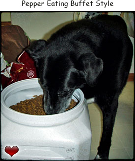 The pic titled "Pepper Eating Buffet Style" was one we took when he was around 14 years old. When Pepper was a puppy, he used to hate eating. He would often leave his food in the bowl for days and only eat when he finally broke down and got really hungry. We would do everything to try and entice him, but for some reason he would often sniff his food and walk away. It wasn't until he was around 12 or 13 when he finally had a good appetite, and he consistently ate 2 meals a day. One day, we brought home a new bag of food and as soon as we poured it into the storage bin, he went straight for it and just started eating from the top. We were so amazed because it had taken us a good 12 years before we could get him to eat anything that to see him eating straight from the food bin was a happy site for us.